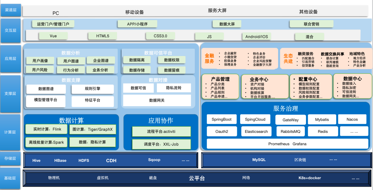 平臺(tái)結(jié)合互聯(lián)網(wǎng)金融的特點(diǎn),包含PC、小程序、H5等多種渠道,極大地滿(mǎn)足客戶(hù)多樣化運(yùn)營(yíng)的需求,滿(mǎn)足”集中管理,多端運(yùn)行“設(shè)計(jì)原則。通過(guò)產(chǎn)品中心、接入中心夠能便捷實(shí)現(xiàn)資產(chǎn)接入與產(chǎn)品管理。接入中心可以對(duì)接多方、多樣的數(shù)據(jù)源,通過(guò)數(shù)據(jù)網(wǎng)關(guān)、隱私計(jì)算,基于數(shù)據(jù)不出域的原則實(shí)現(xiàn)多方共享,同時(shí)解決數(shù)據(jù)安全問(wèn)題。
