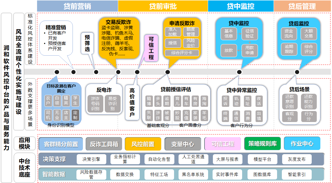 潤和軟件為銀行量身打造信貸智能風控解決方案,貫穿貸前至貸后全流程,確保風險全面受控。基于強大的中臺技術底座,我們提供靈活且高效的智能數據支持及決策平臺,輕松與客戶現有科技體系融合,為業務升級提供持續動力。開箱即用的應用模塊,如客群細分、反欺詐工具等,均經過深度抽象,實用性極強,支持快速部署。潤和還助力建設標準化的風控體系,從精準營銷到貸后監控,全方位打造定制化風控模型。更引入豐富的高價值外部數據與模型接口,結合專業第三方數據,為銀行信貸安全構筑堅實屏障。
