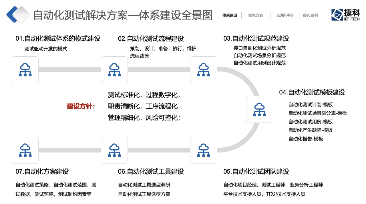 捷科自動化業務線是公司為了提升客戶服務體驗,成立的專業化業務線之一,負責為客戶提供專業化的自動化測試服務,提供測試平臺、開發等相關技術賦能;